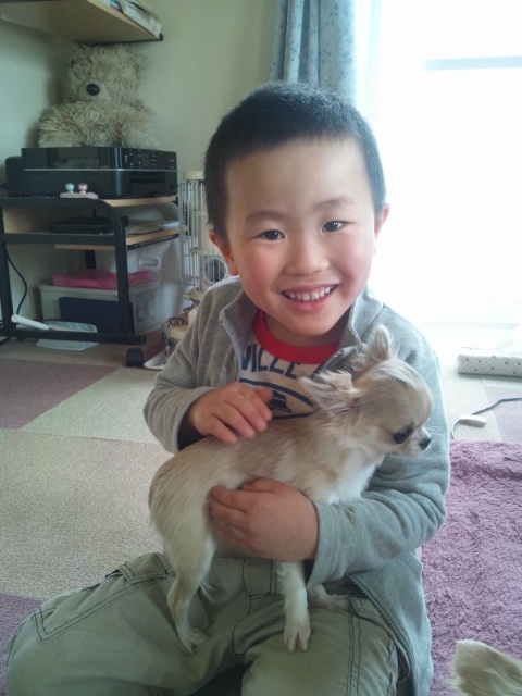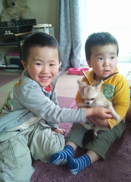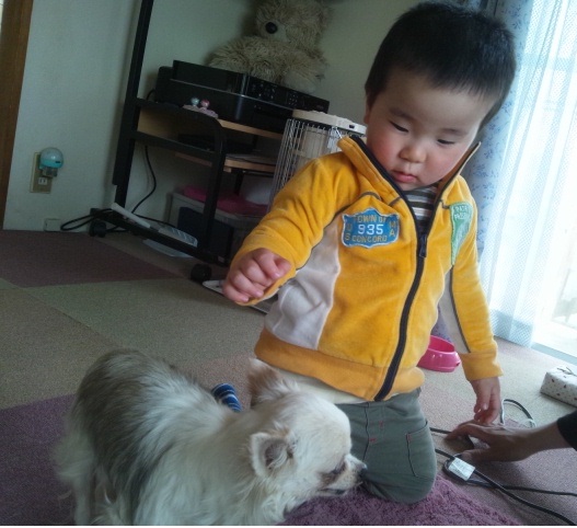賢士の膝の上にチコちゃん賢士はキャロルがお気に入り 慧文はチコちゃん