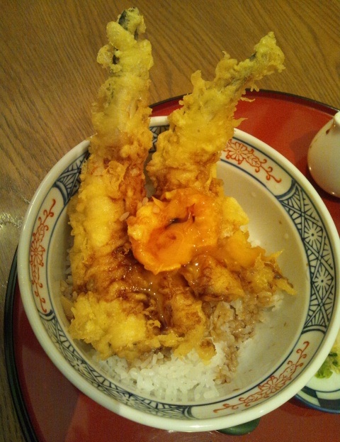 大きなてんぷらの上の半熟卵、トロ~リ美味しそう