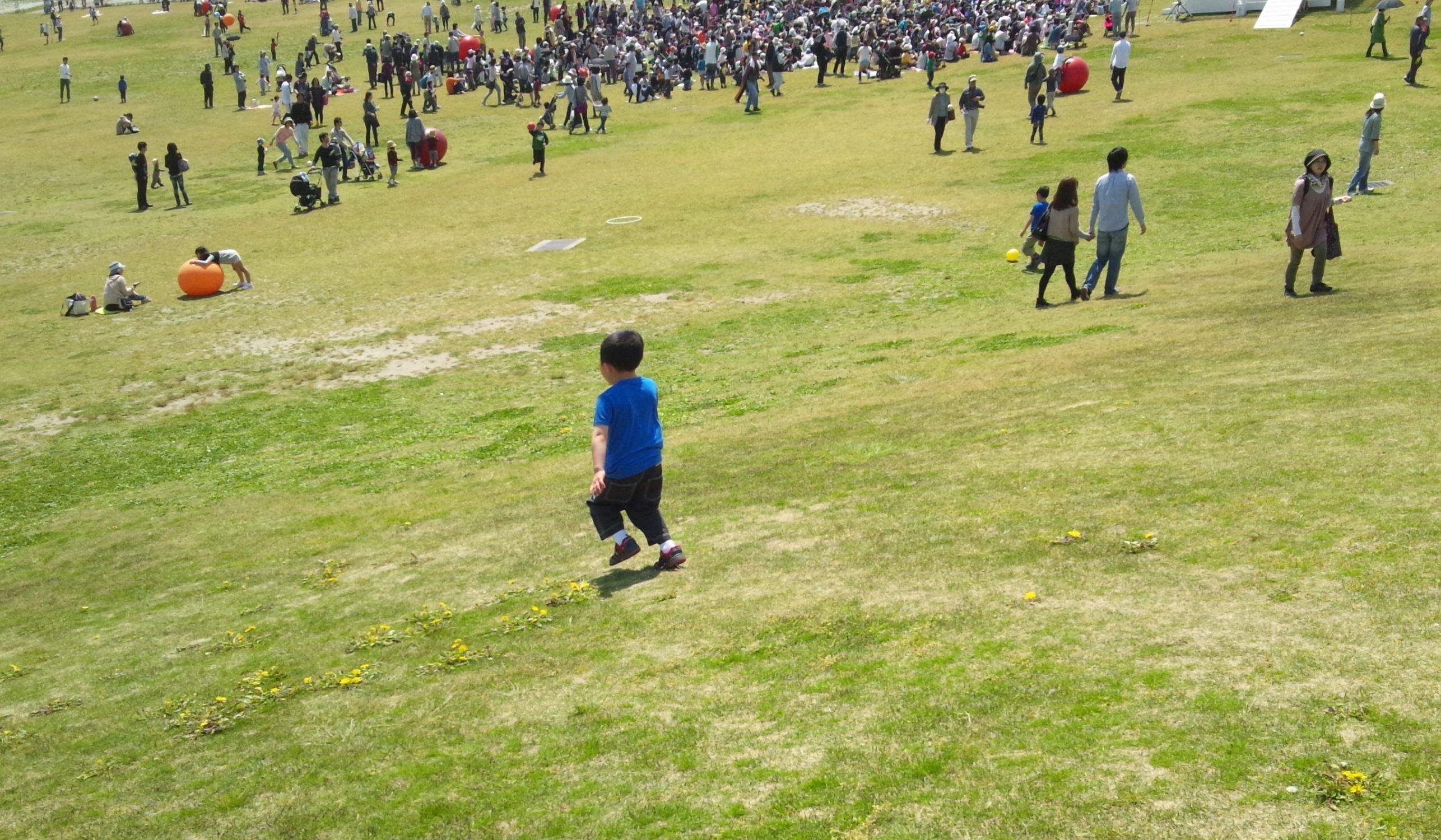芝の丘を大玉バウンスしたりして楽しそう